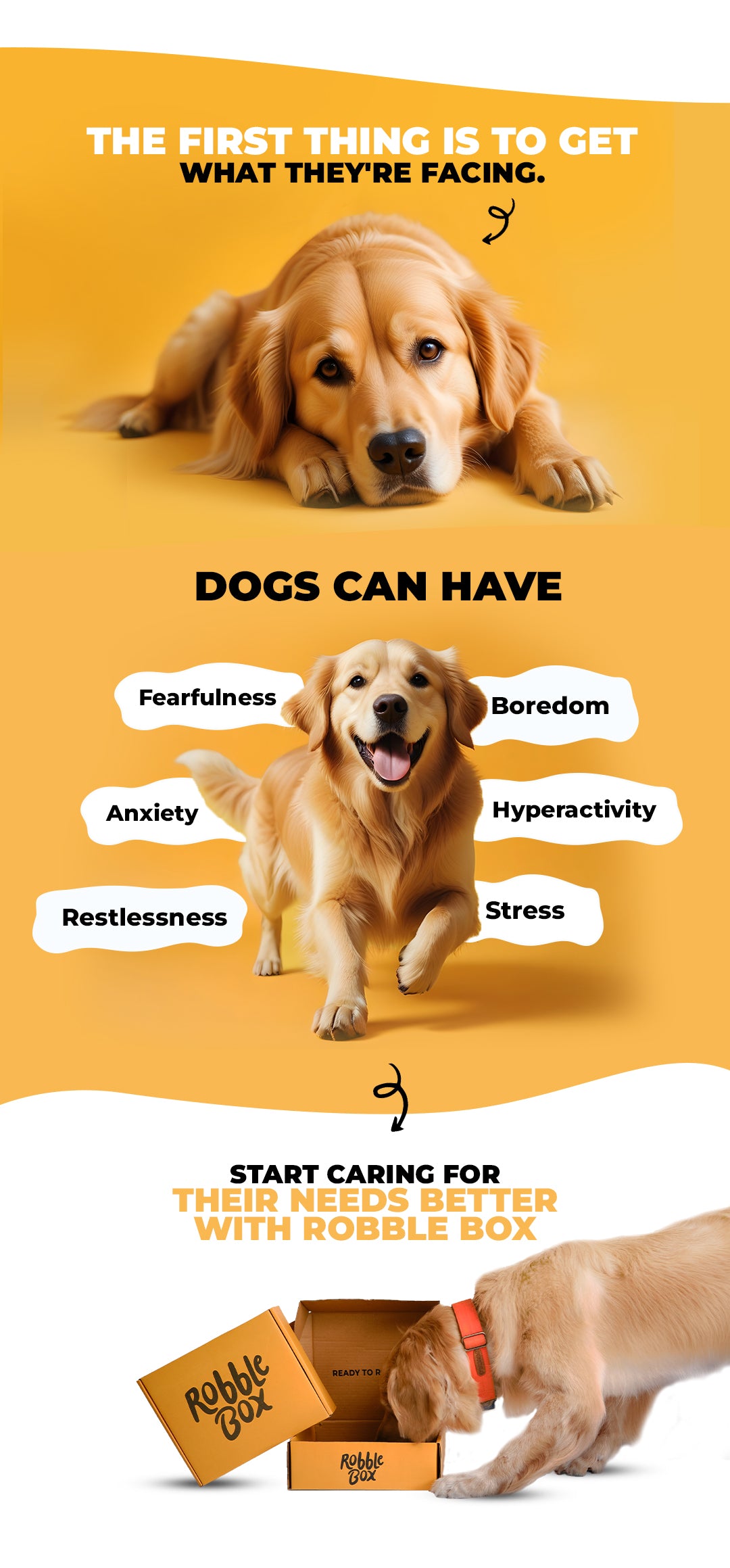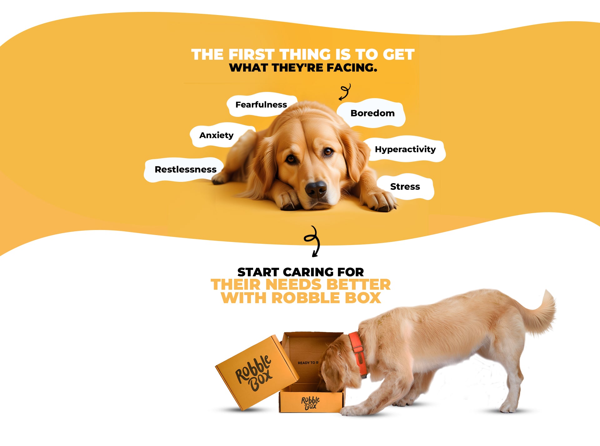 Robble Box is your one-stop solution to help dogs overcome common behavioural issues. Our specialized boxes contain expert-curated toys designed to soothe stress, alleviate anxiety, provide mental stimulation, and keep your pup happy.